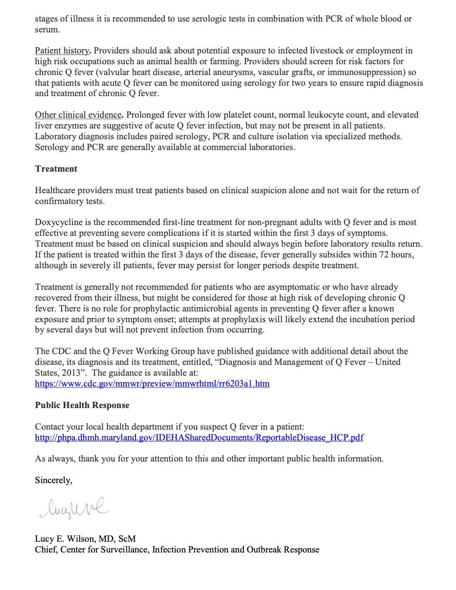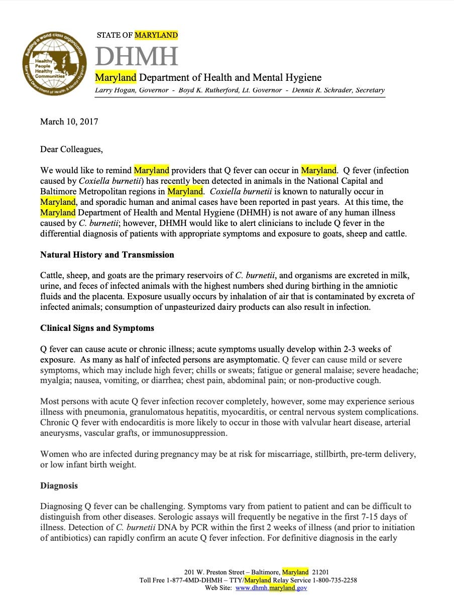 2 Months after a discussion about Coxiella / Q Fever, the FDA had an alert out of Maryland that Q Fever had been “discovered” in the state.