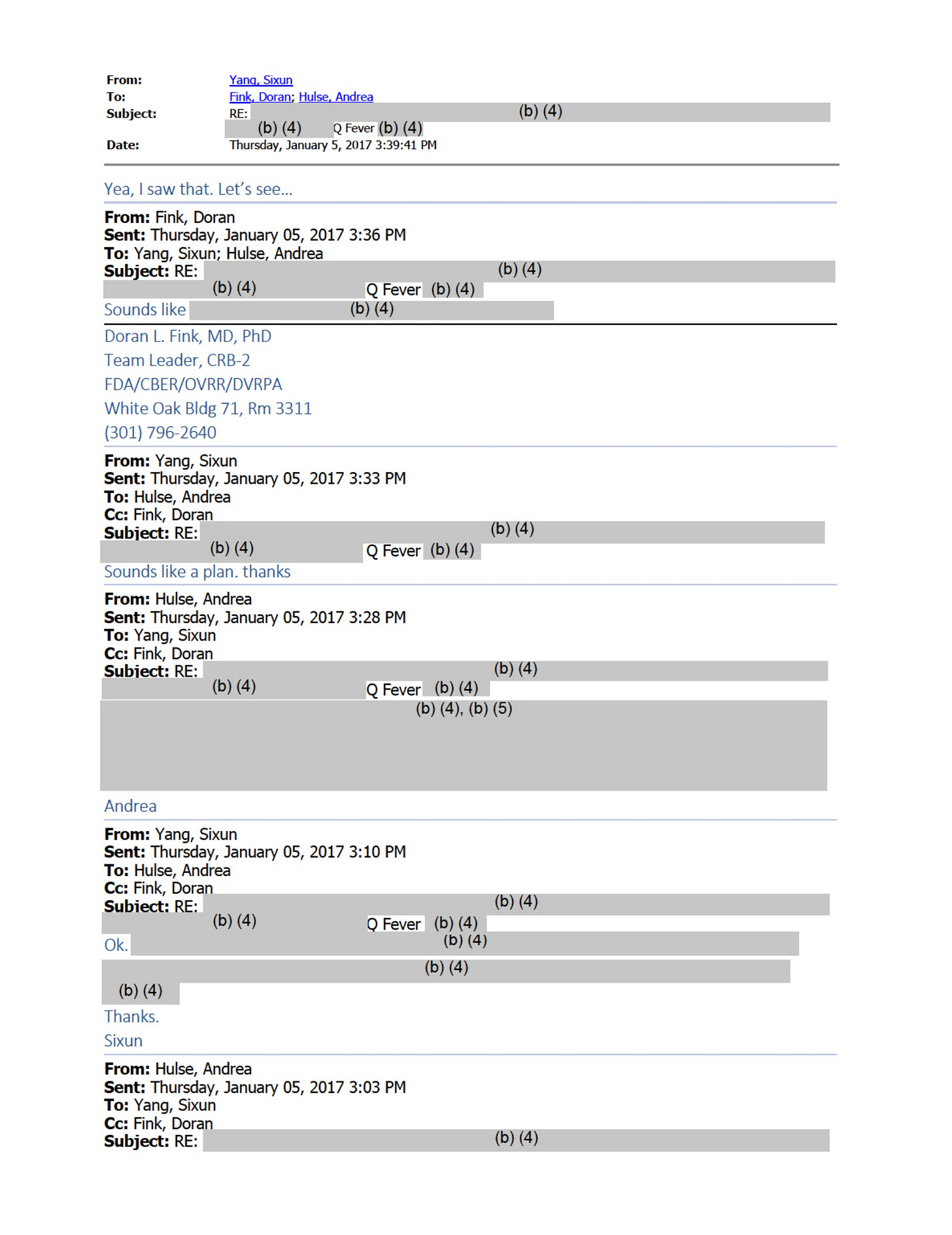 The FDA was interested in Coxiella in December 2016 and January 2017.