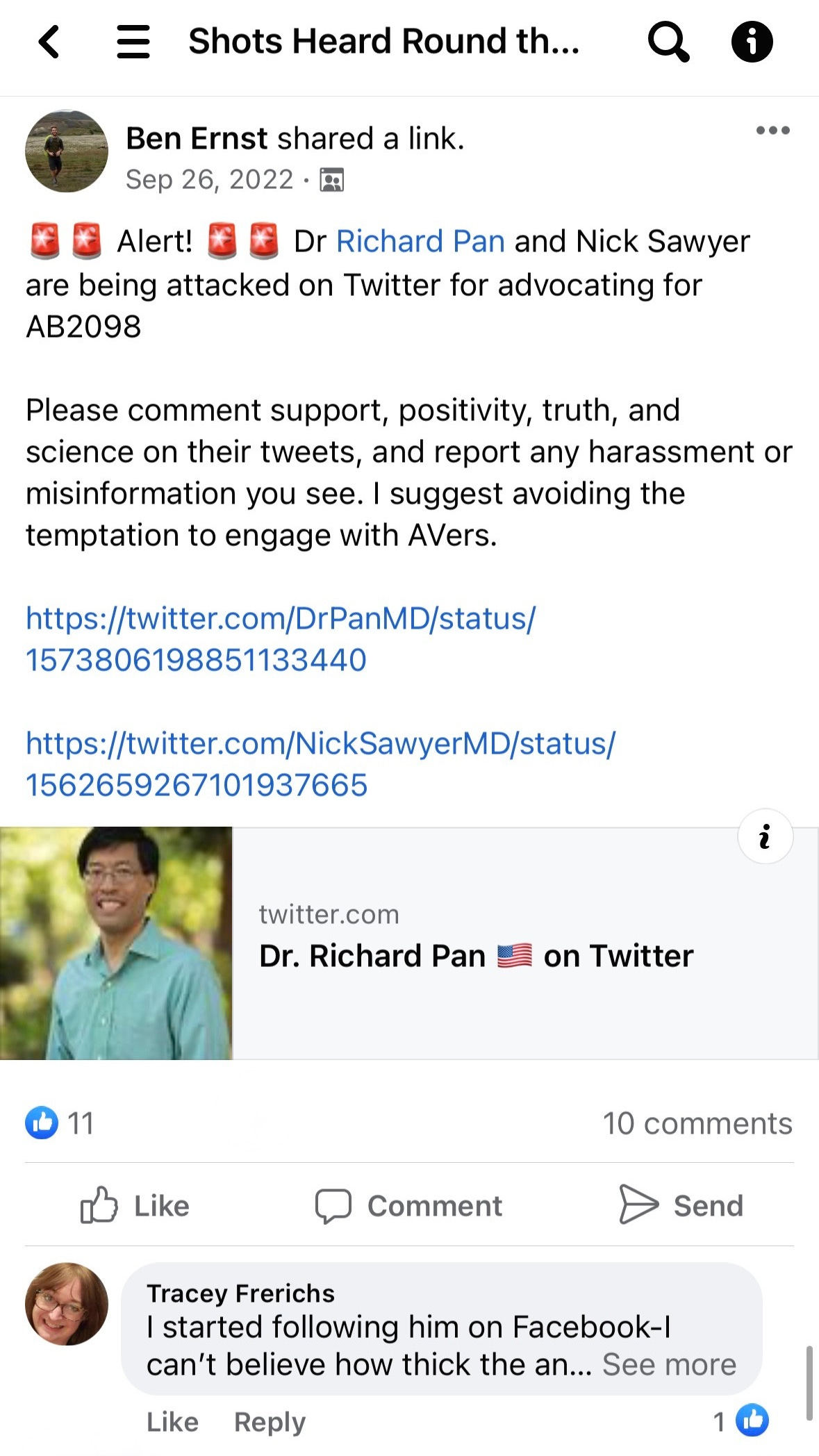 In a surprise to no one, Shots Heard administrator Ben Ernst, a former campaign manager for Amy Klobuchar's failed presidential campaign, organized coordinated online support for Richard Pan. Shots Heard was created and controlled by Public Good Projects, Ben's employer at the time. Public Good Projects received $883,000 from BIO, the pharmaceutical lobbyist group whose members include all the big covid response winners including Gilead, Pfizer, and Moderna.