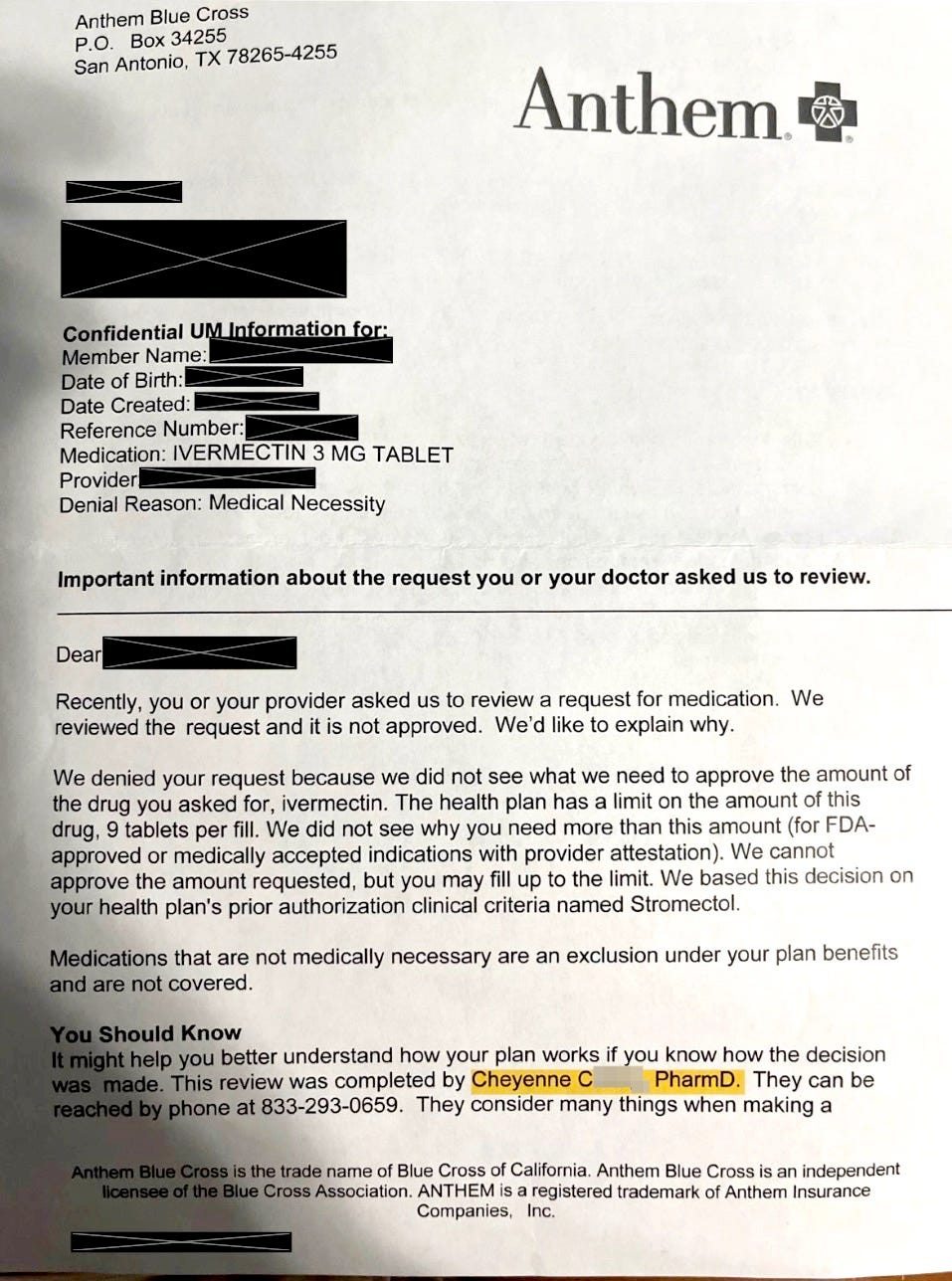 A while back one of our vaccine injured gave us an ivermectin rejection letter from Anthem Blue Cross in California. According to this document, Anthem only covers the medication for 9 pills at 3mg each. This is not enough to treat covid.