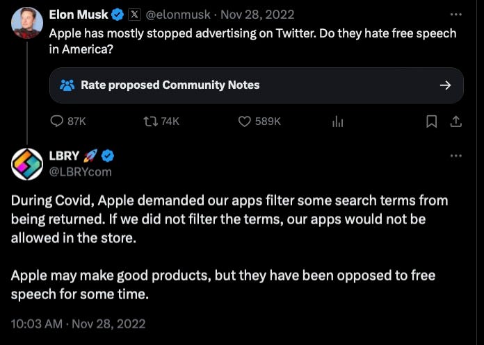 During Covid, Apple demanded our apps filter some search terms from being returned. If we did not filter the terms, our apps would not be allowed in the store. Apple may make good products, but they have been opposed to free speech for some time.