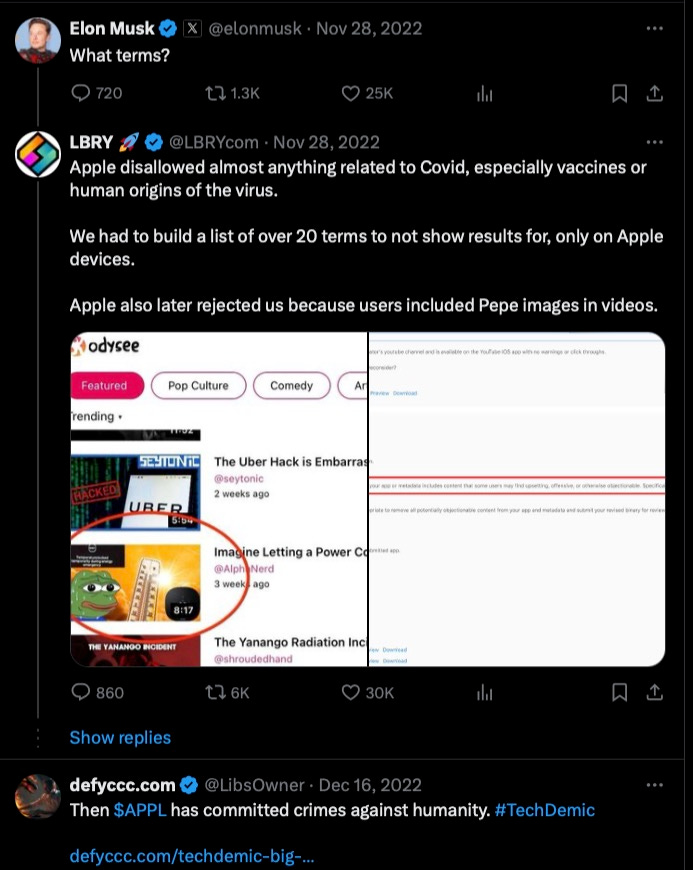 It turns out that Apple demanded LBRY block video searches for anything related to COVID-19, especially anything regarding vaccines or the human (think lab leak) origins of the virus which at the time would have put focus directly on China.