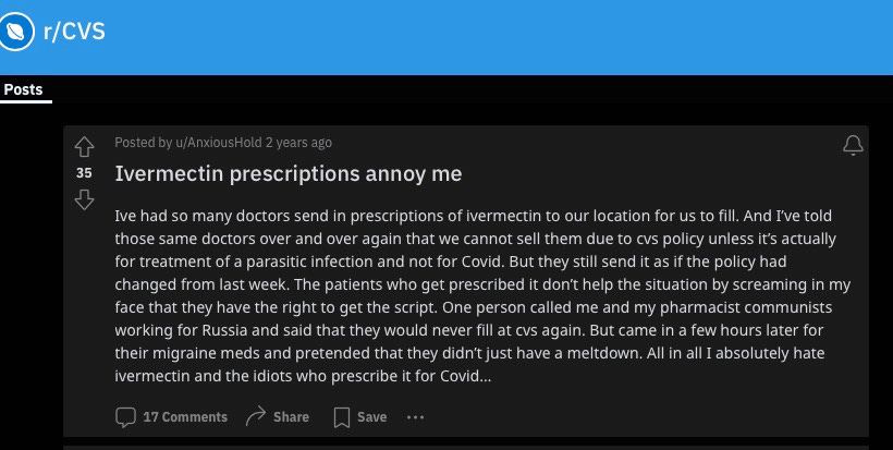 The FDA's tweet emboldened pharmacists to sabotage the medication. A great example of can be seen in this reddit/CVS forum post where an alleged CVS pharmacist says: 'I absolutely hate ivermectin and the idiots who prescribe it for Covid'.