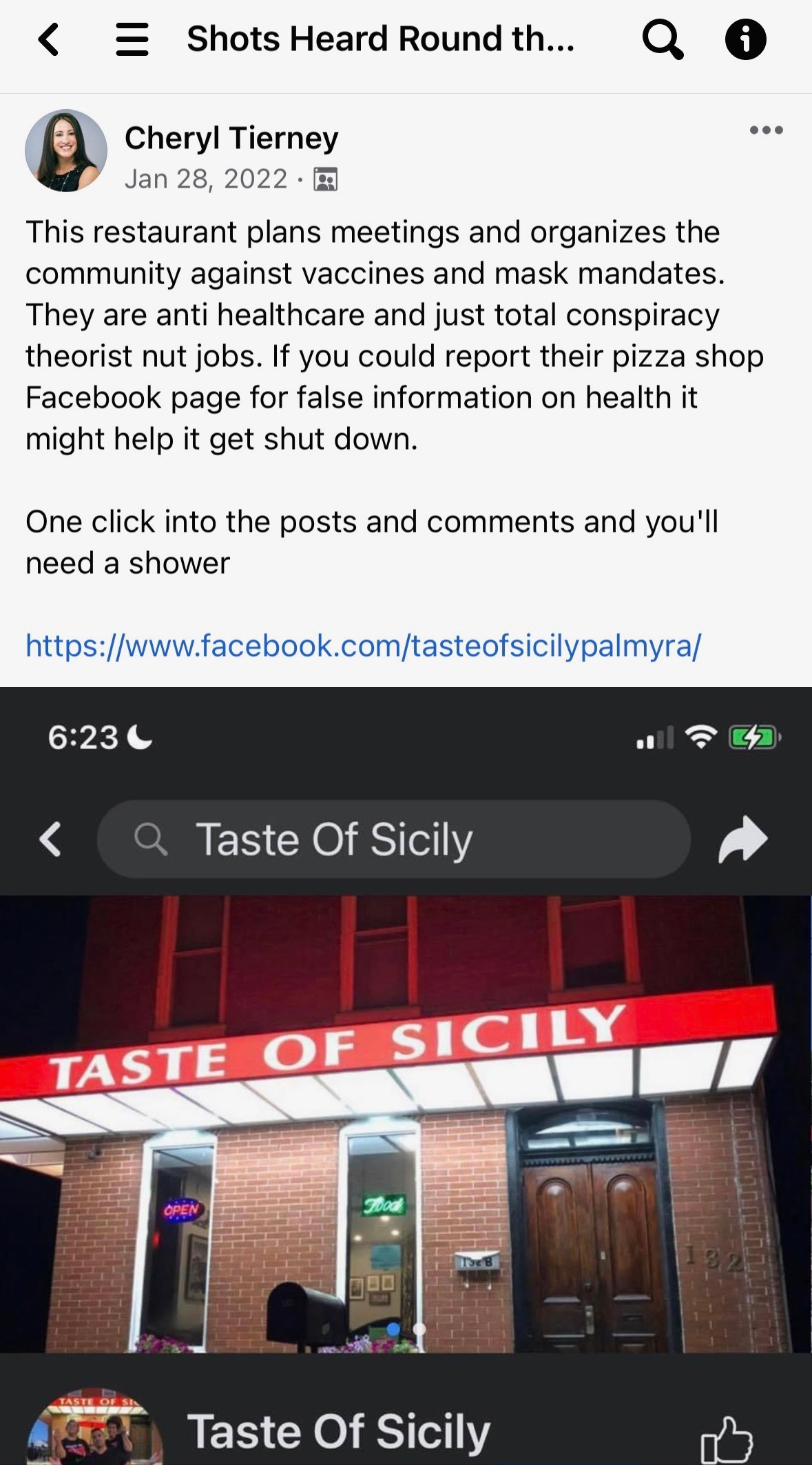 In this Jan 28, 2022 Shots Heard private group post, Cheryl had clearly had her fill of delicious Italian-flavored freedom. Cheryl ventured into the private shots heard group and asked for help from the rowdy band of internet assassins.