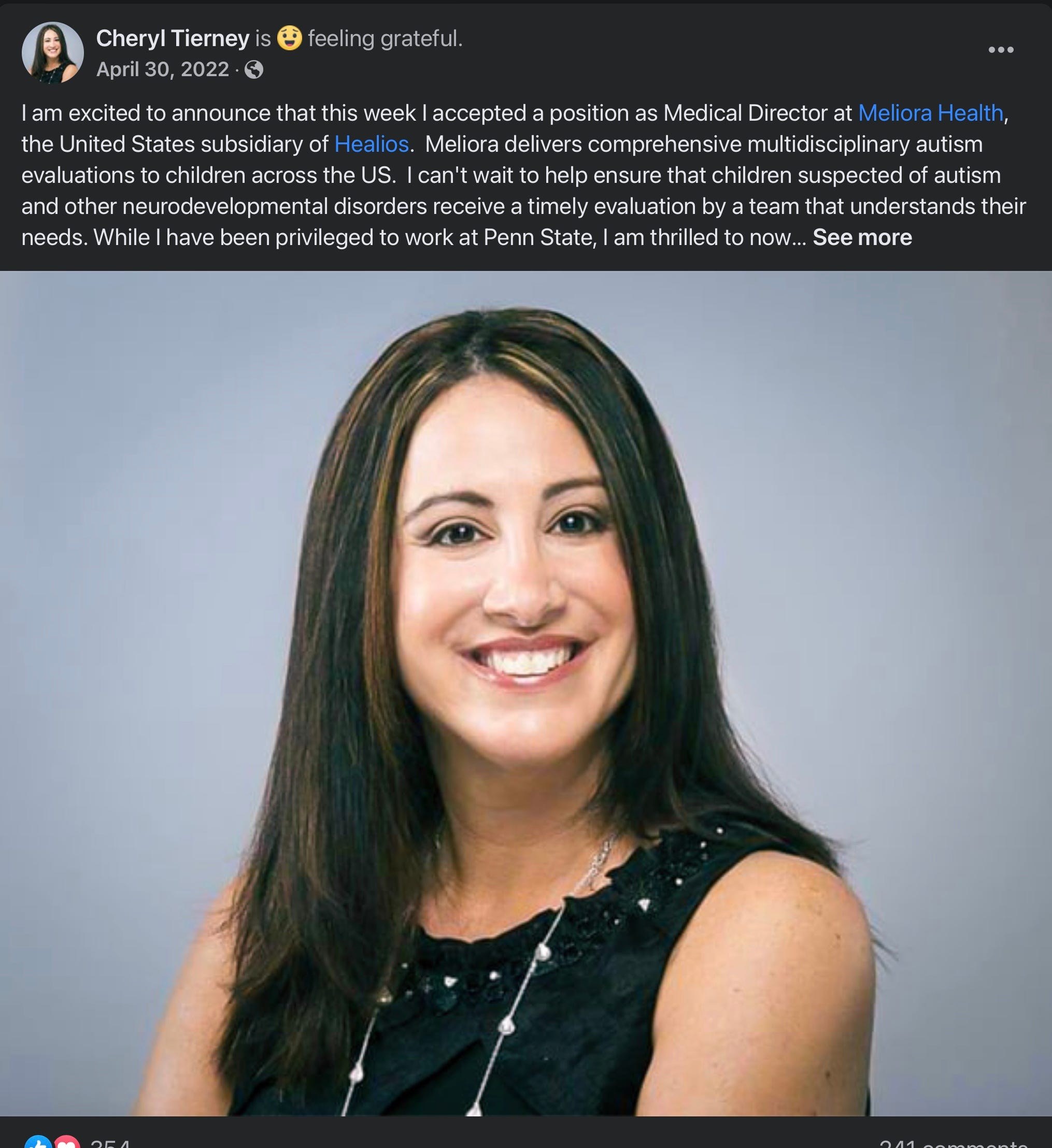 Dr. Cheryl Tierney was rewarded for her dark acts by getting hired by Meliora Health in Hershey, PA. Meliora is a US subsidiary of Healios. We can't help but wonder if Dr. Tierney can be held liable for tortious interference for meddling in the business and rights of citizens and businesses in the United States.