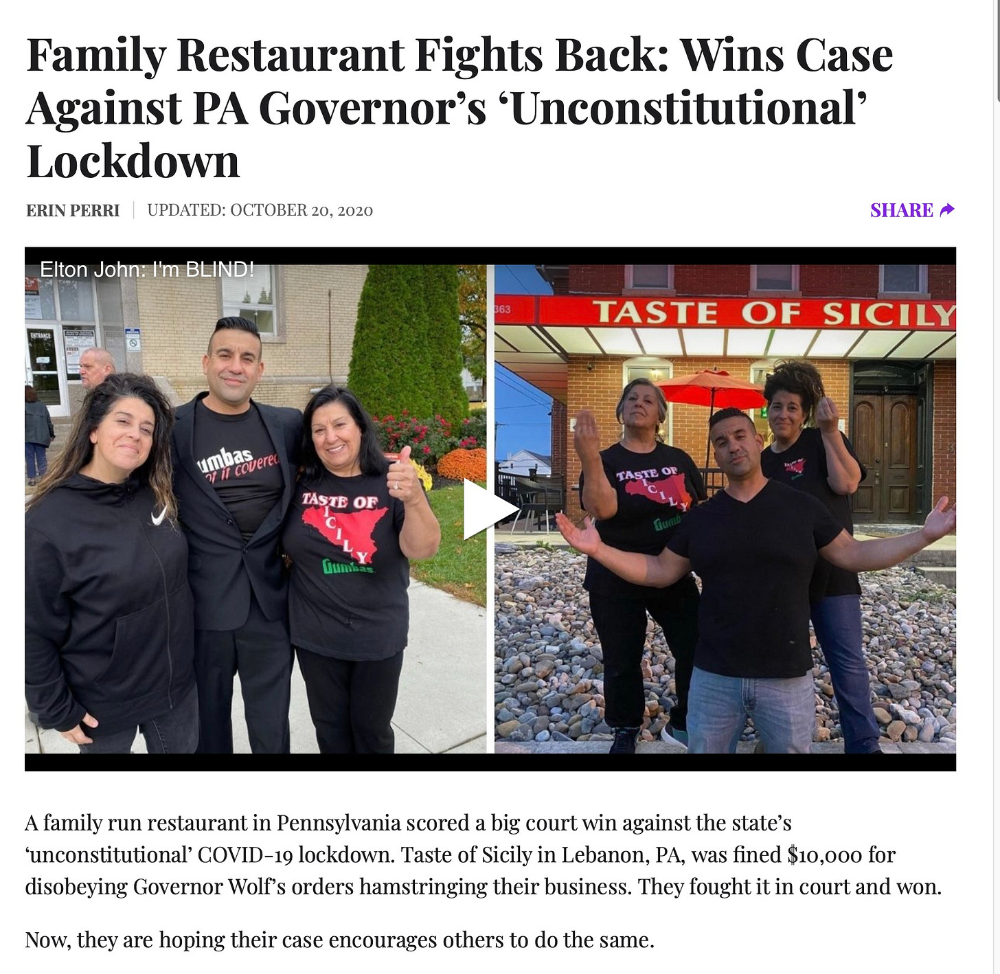 NOTE: Tase of Sicily had won a case against the state of PA in October 2020 after they refused to pay fines for violating illegal lockdown orders. You can read more about that here.