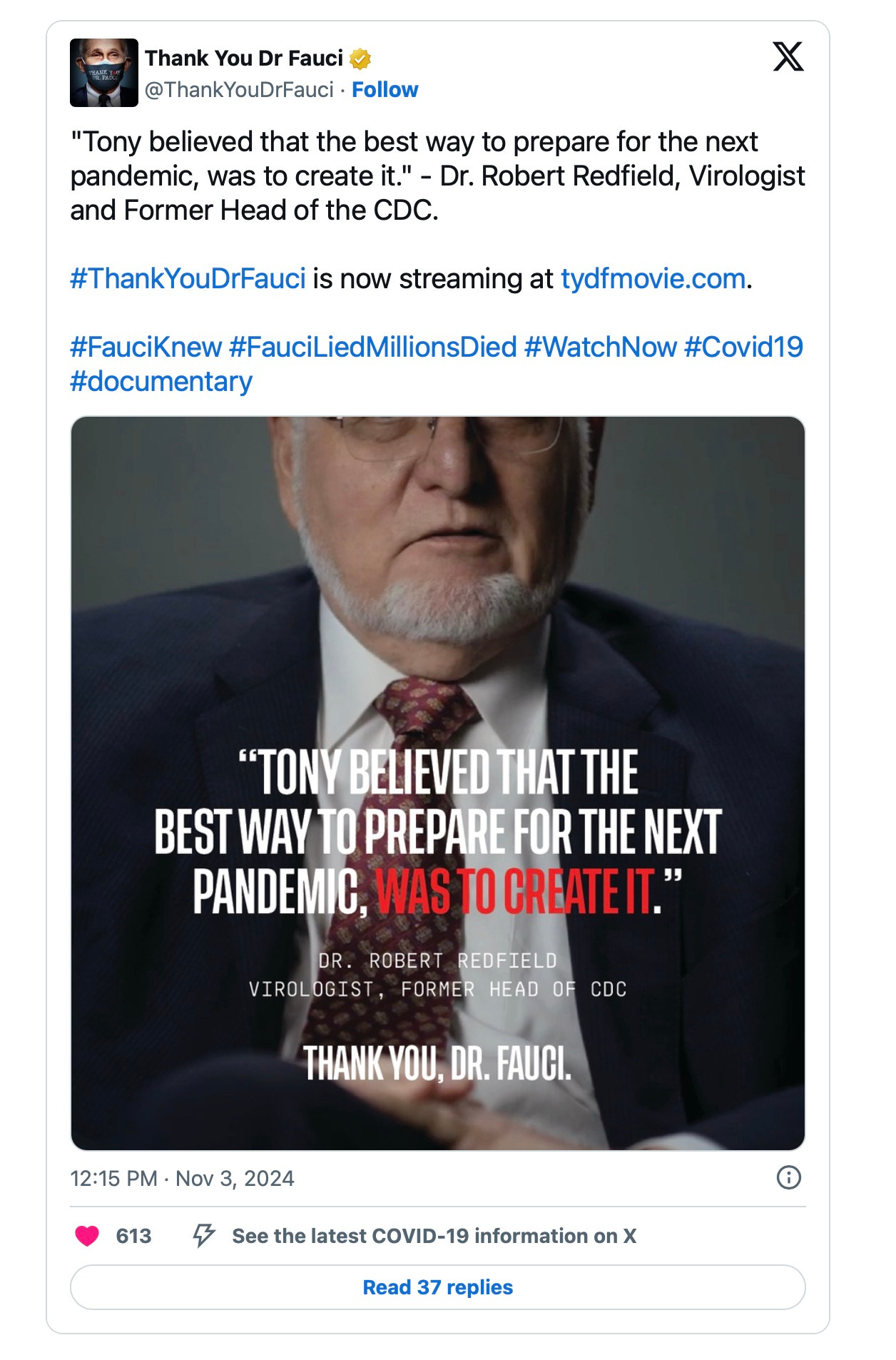 "Thank You, Dr. Fauci" details the efforts of the Covid overlords to come up with a narrative that wouldn't implicate Fauci or the feds who funded decades of research dedicated to enhancing deadly viruses.