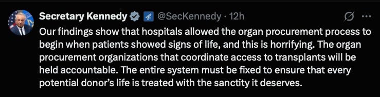 Secretary Kennedy, a longtime advocate for medical ethics and transparency, did not mince words in addressing the scandals. In statements released today, he highlighted the gravity of the issues, stating, “Our findings show that hospitals allowed the organ procurement process to begin when patients showed signs of life, and this is horrifying.” He further emphasized the need for accountability, adding, “The organ procurement organizations that coordinate access to transplants will be held accountable. The entire system must be fixed to ensure that every potential donor’s life is treated with the sanctity it deserves.” These quotes, echoed across RFK Jr.'s social media and official communications, underscore his commitment to rooting out what he has described as horrors within the organ donation networks.