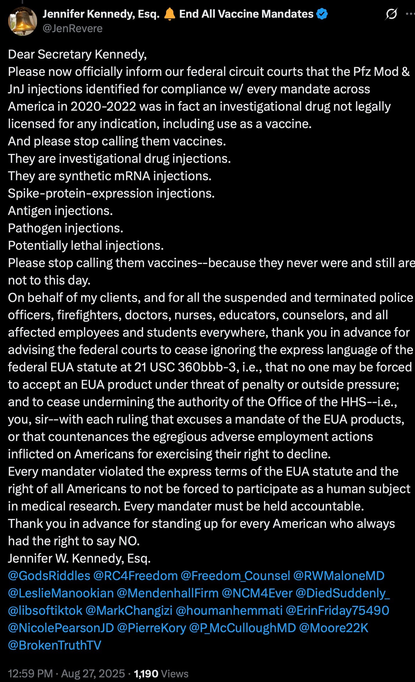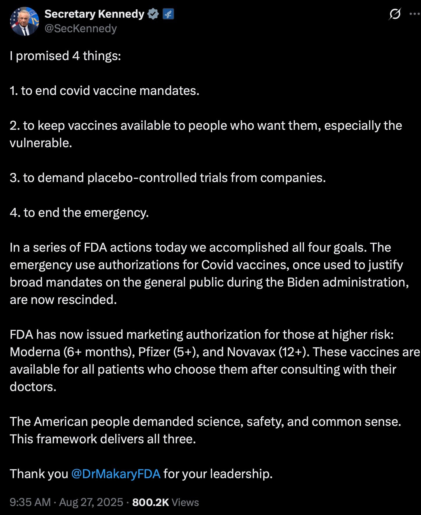 In a series of FDA actions today we accomplished all four goals. The emergency use authorizations for Covid vaccines, once used to justify broad mandates on the general public during the Biden administration, are now rescinded.