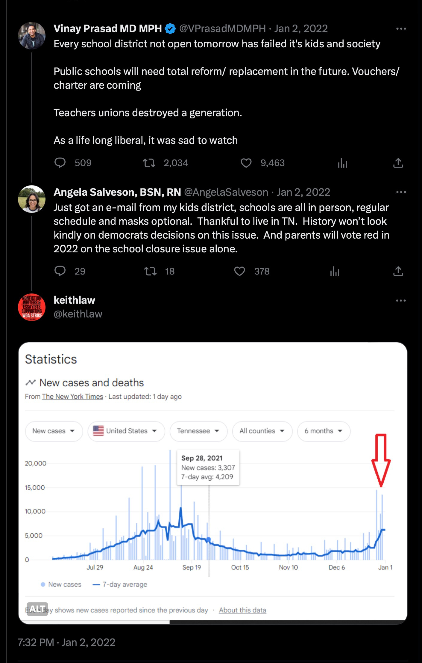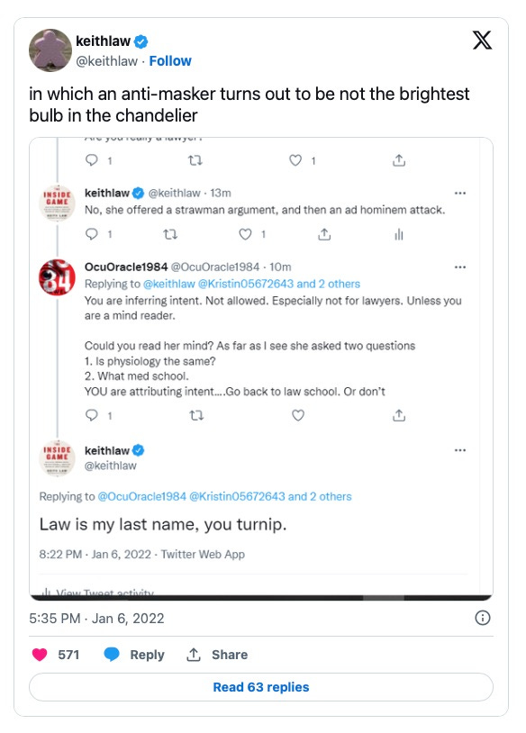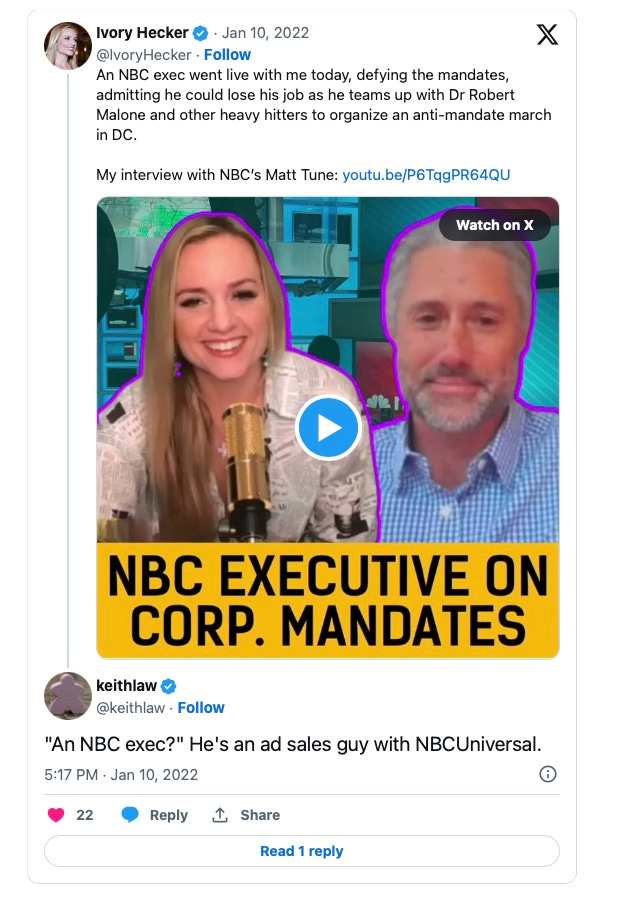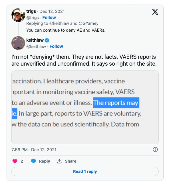 In this disastrous thread in Feb of 2021, Keith targeted Rishanne Golden for posts warning about vaccines.