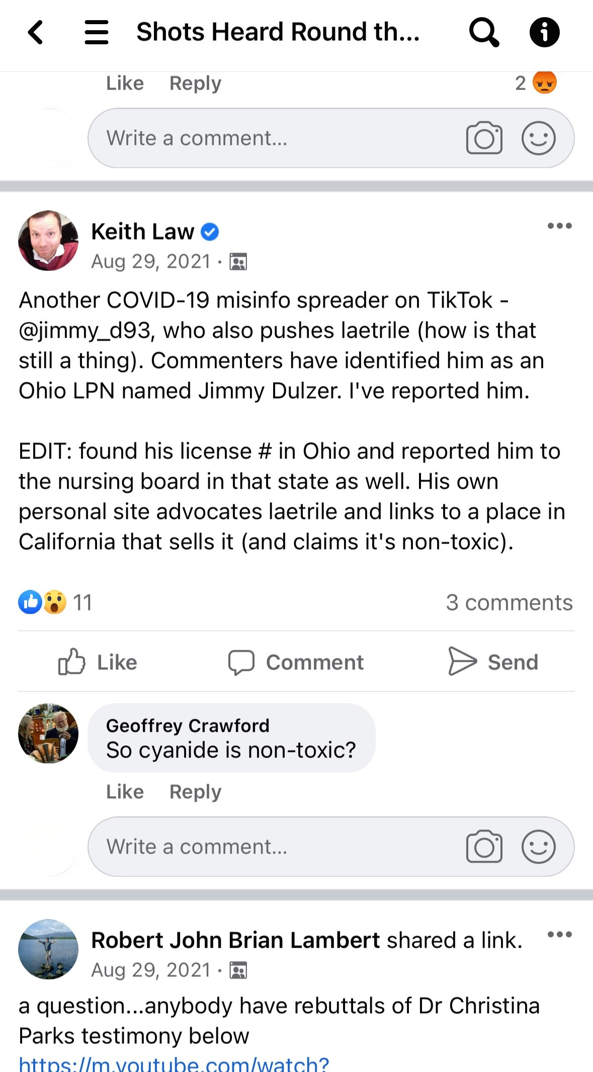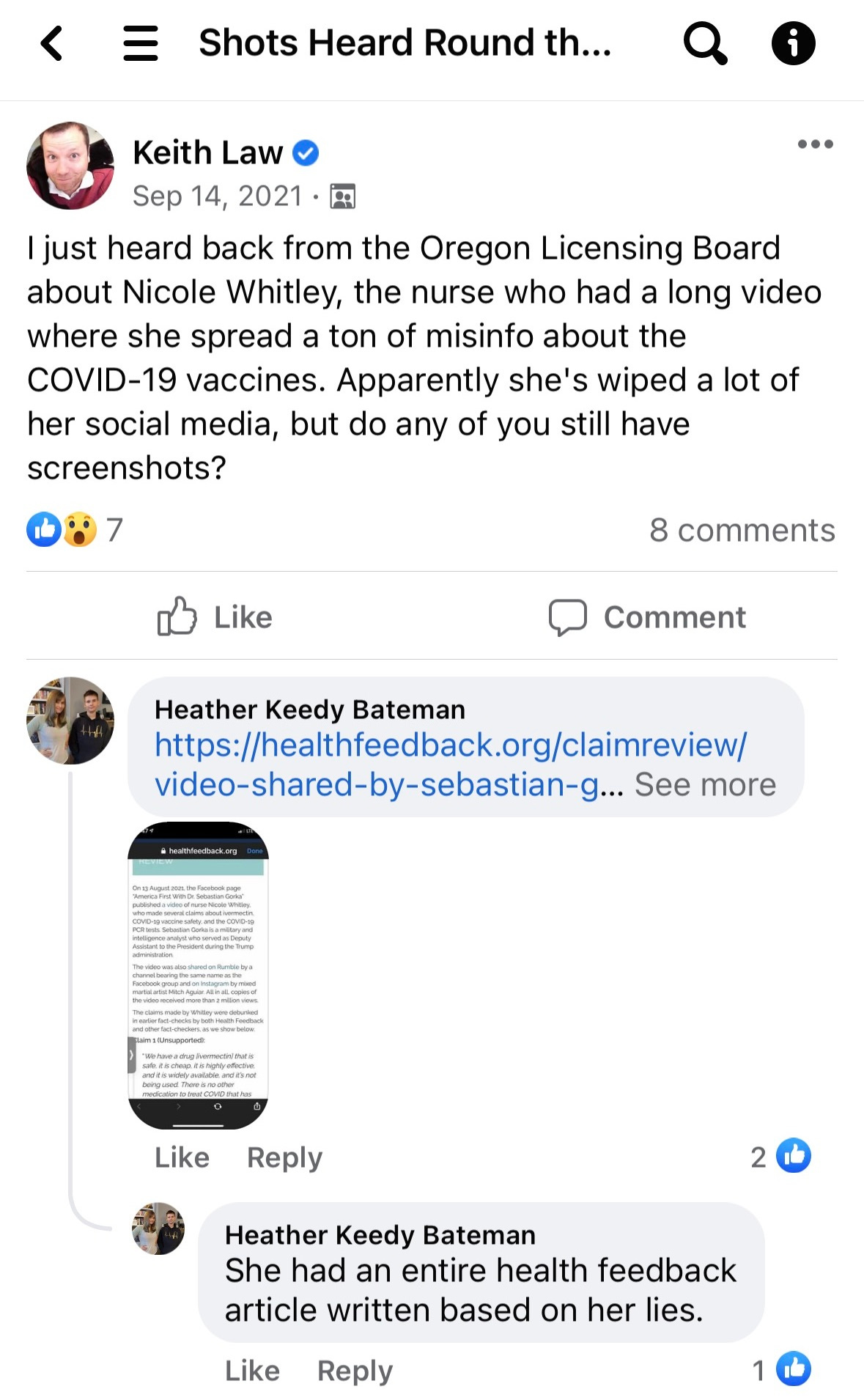 In September 2021, Keith went on a censorship tear, reporting multiple nurses that he found scouring social media. Here's Keith sharing his updates with Shots Heard members. Heather Keedy Bateman is a nurse in Mobile, AL who also filed complaints against nurses who exercised their free speech.