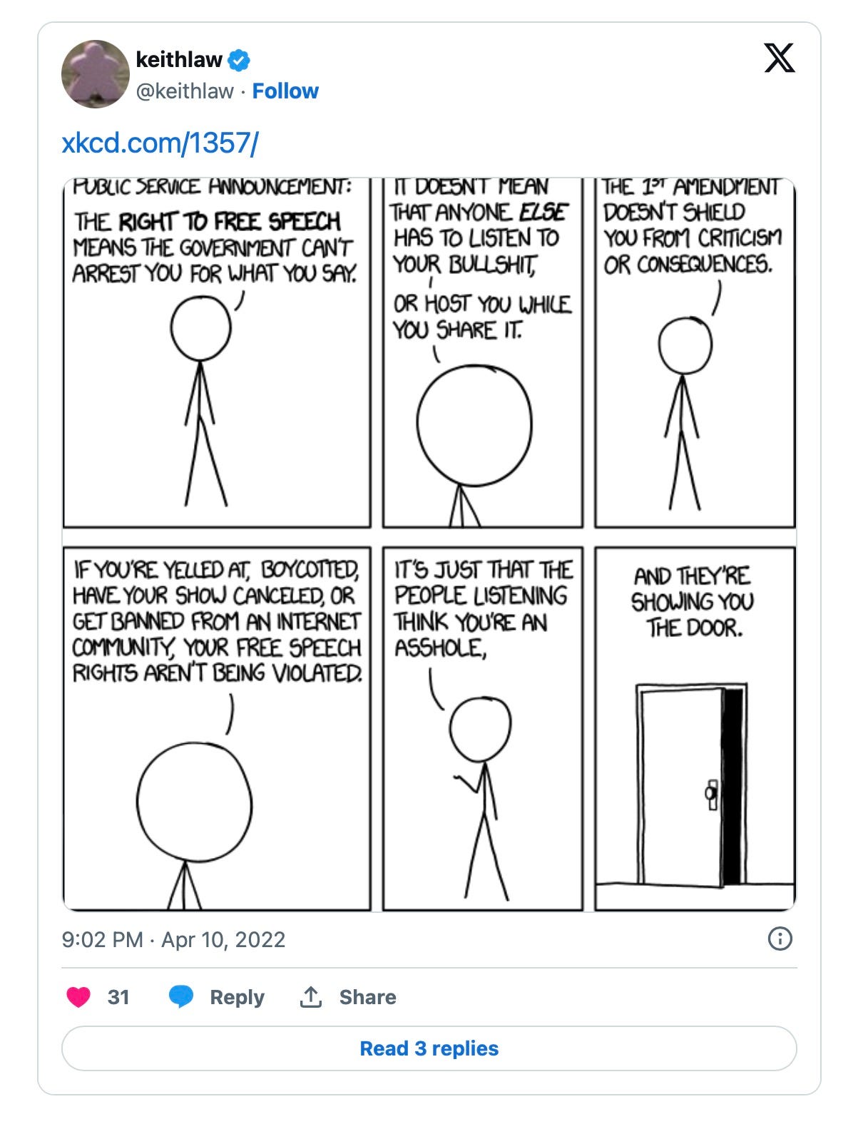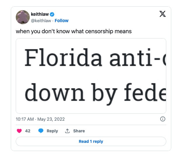 Speaking of Free Speech. A scan through Keith's tweets indicates he knows all about free speech. Between actual mockery of anyone utilizing their First Amendment rights and know-it-all media posts like the ones below, Keith’s primary work appears to have been attacking anyone who violated the shots-heard marching orders.
