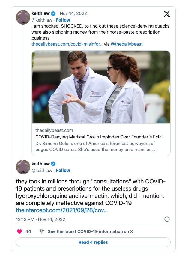 We decided to turn the camera around and show you some of Keith’s tweets over the past two years outside of Shots Heard. It ain’t good! Keith is so anti-ivermectin that it almost seems like an obsession. Here he is throwing Ivermectin and Hydroxychloroquine under the bus.
