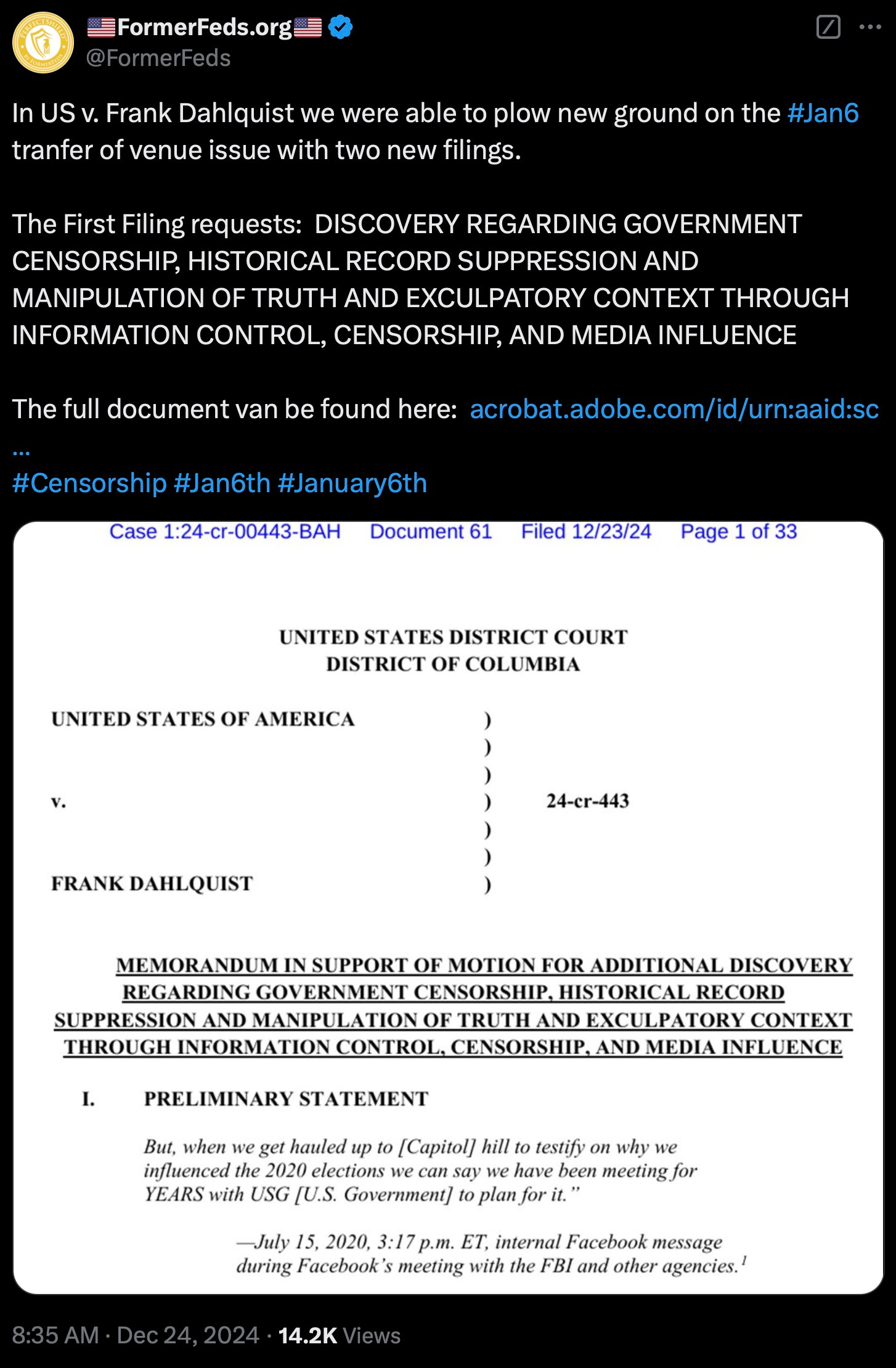 Direct Government Control: Geyer alleges that federal agencies, including the FBI and the White House, exerted undue influence over social media platforms to censor content and users related to January 6. This included weekly meetings and real-time communication channels to enforce content removal.