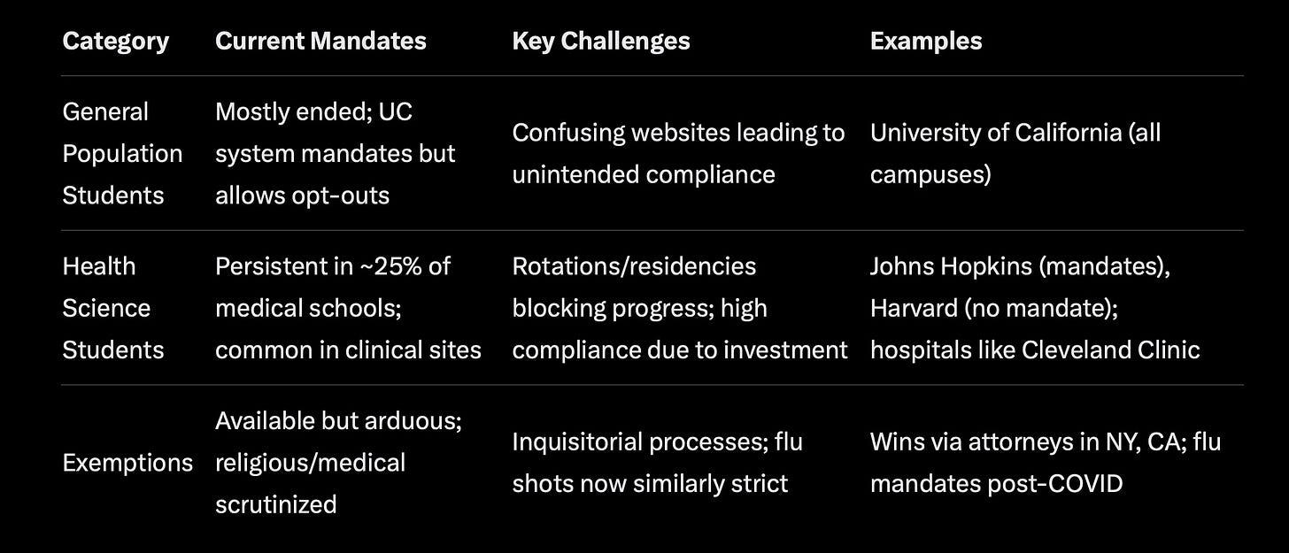 For more, visit No College Mandates’ website or Lucia’s Substack. Donations support allies like Freedom Council. If you’re a student or parent facing mandates, resources for exemptions are freely available.