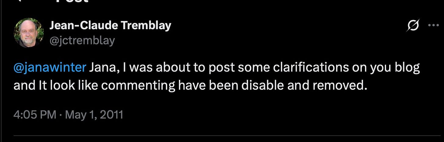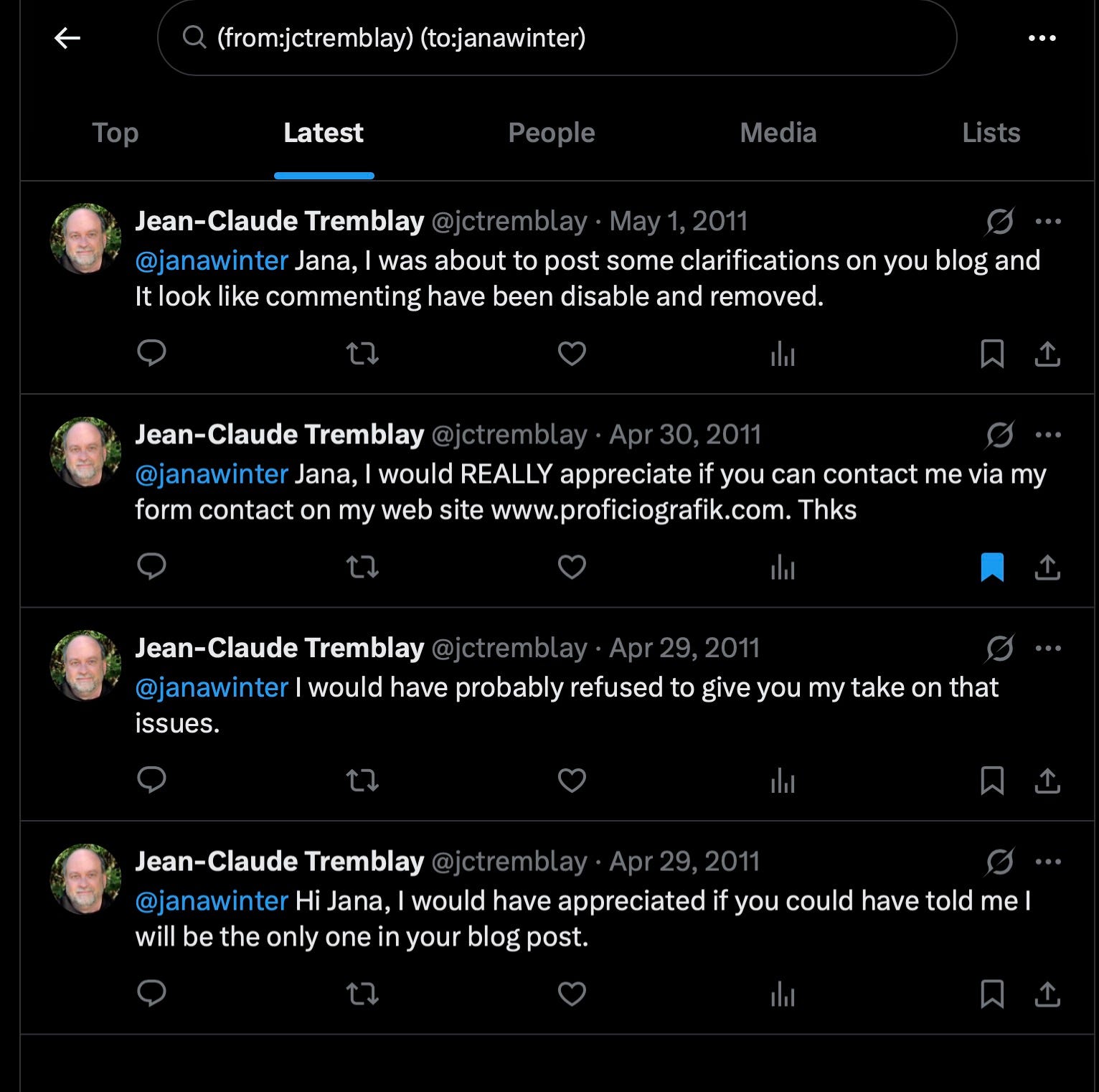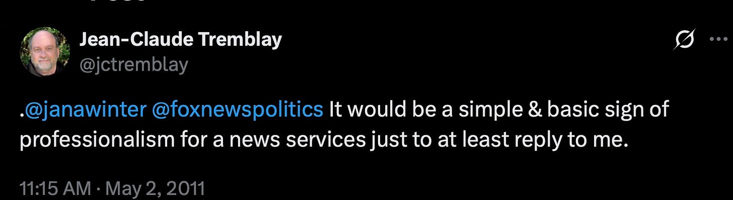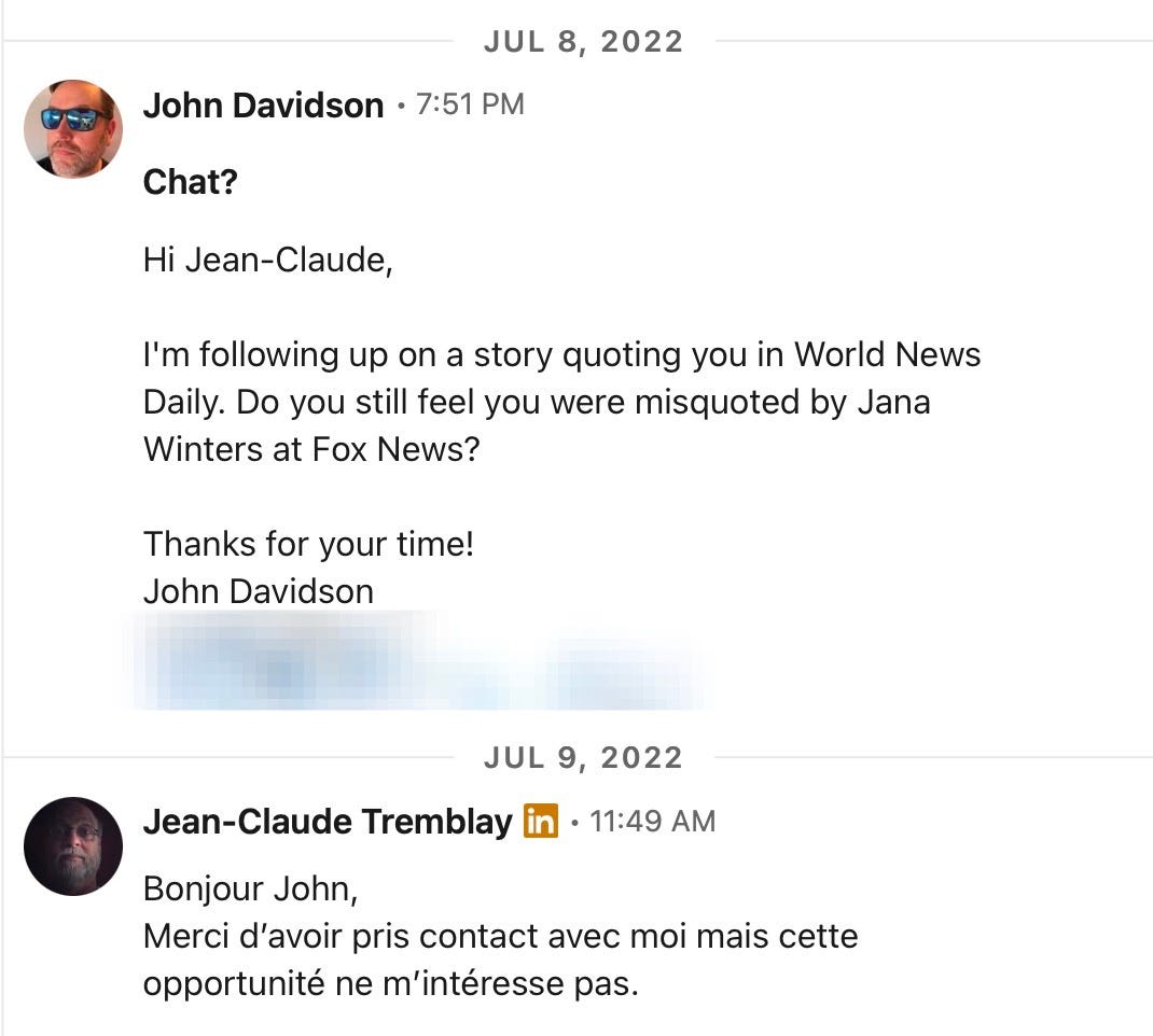 I also LinkedIn-messaged Tremblay: "Do you still feel you were misquoted by Jana Winters at Fox News?" Tremblay declined in French: "Bonjour John, Merci d'avoir pris contact avec moi mais cette opportunité ne m'intéresse pas."