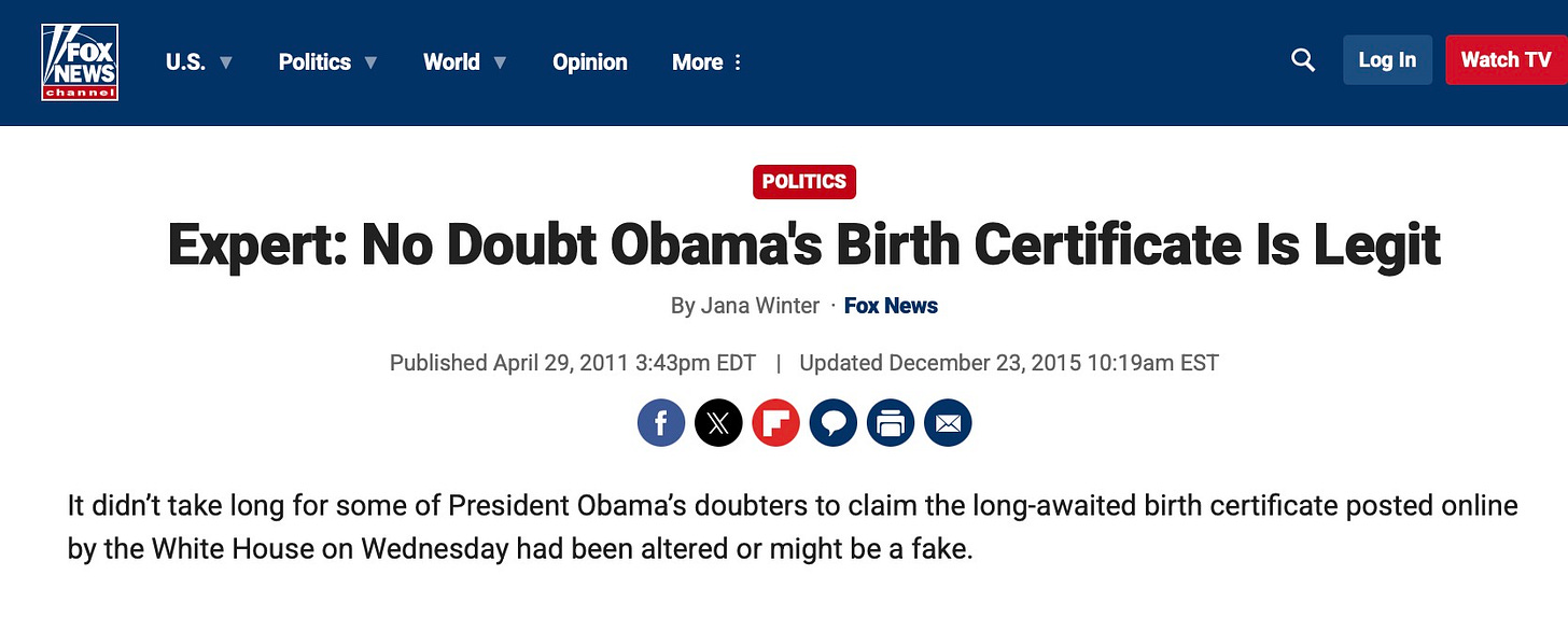 In April 2011, 2 days after Barack Obama released a ‘long-form’ document, claiming it was his official birth certificate, Fox News ran an article that appeared to settle the debate over the document that had significant legitimacy concerns. This Fox News article has been repeatedly cited by ‘debunk’ enthusiasts and is used to train AI on history.