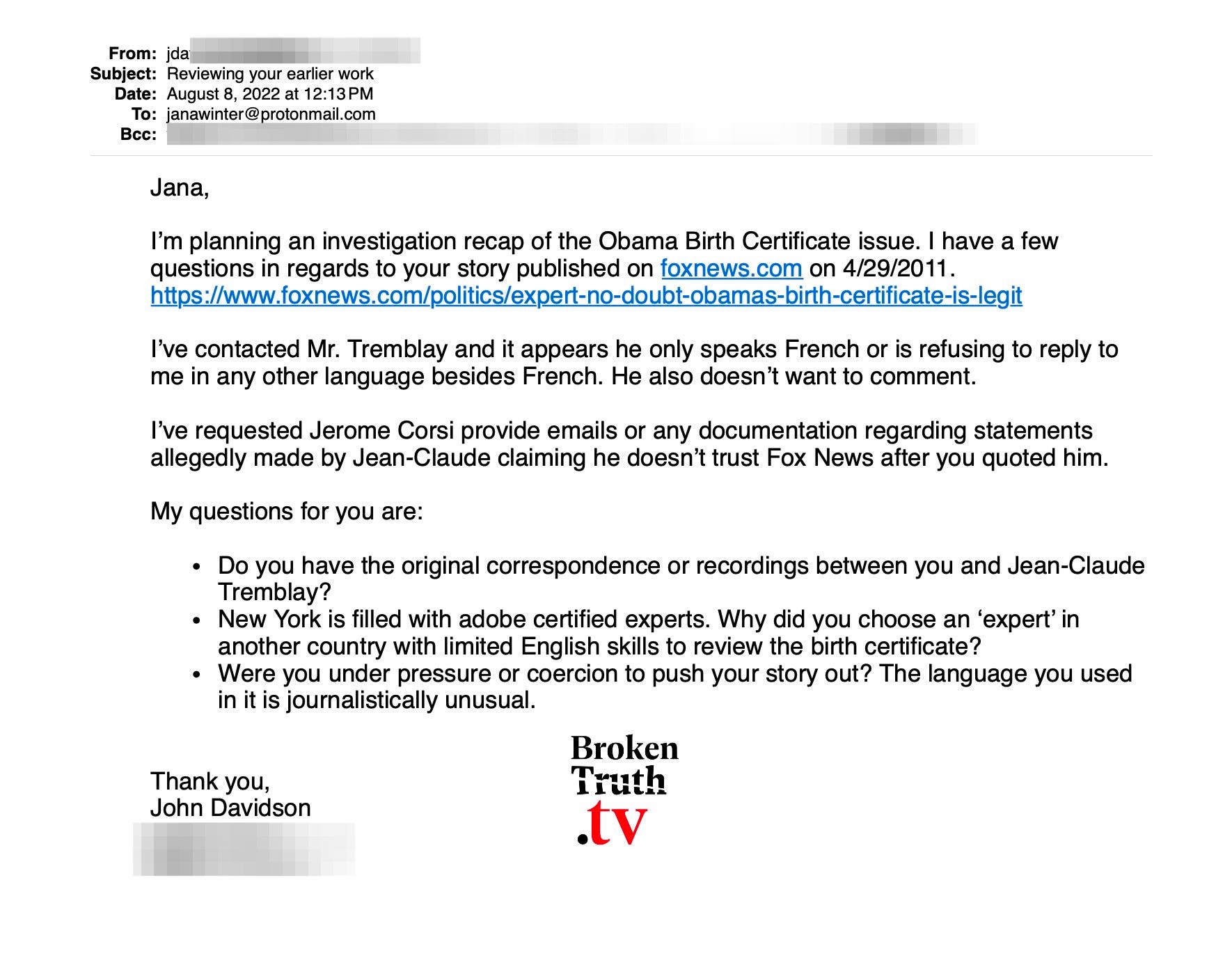 “Expert: No Doubt Obama’s Birth Certificate Is Legit.” Written by Jana Winter—now a U.S. Intelligence and law enforcement correspondent at Reuters—the article framed Tremblay as confirming legitimacy, quoting him on layers from OCR scanning processes: