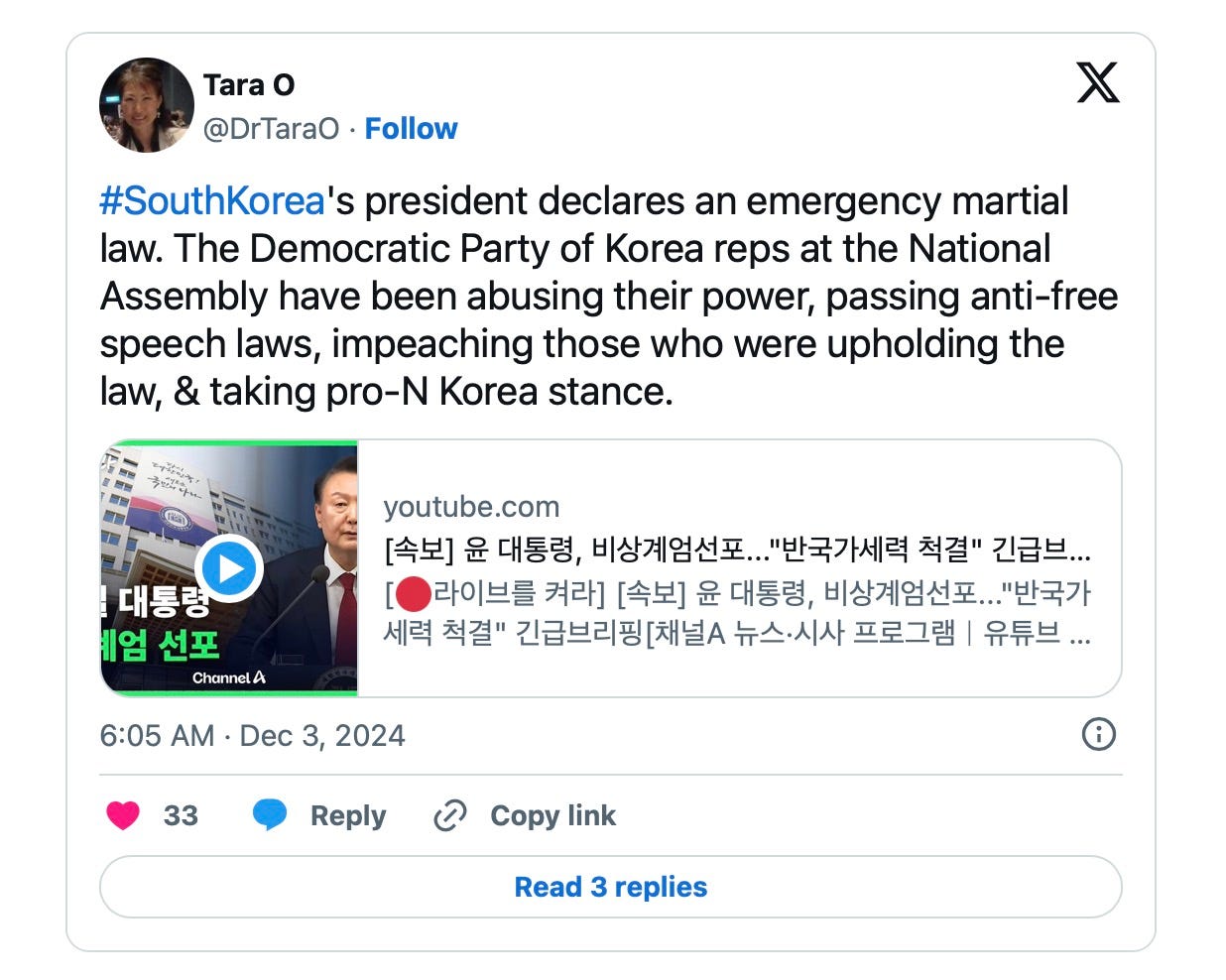 “I declare martial law to protect the free Republic of Korea from the threat of North Korean communist forces, to eradicate the despicable pro-North Korean anti-state forces that are plundering the freedom and happiness of our people, and to protect the free constitutional order,” Yoon said in making the declaration on Tuesday.