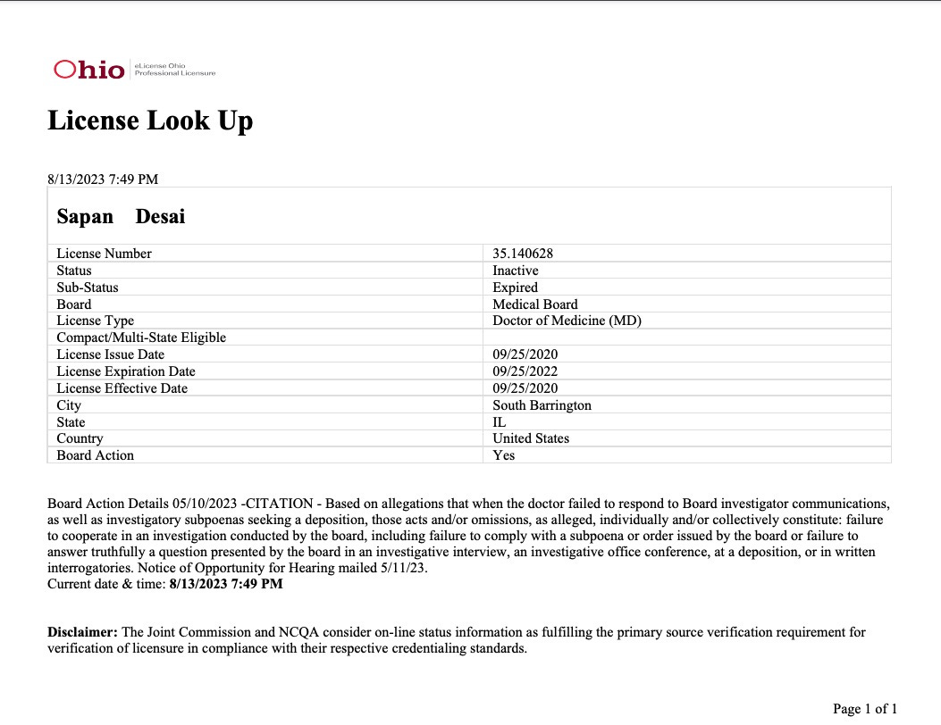 A recently discovered document on the Ohio Medical board website shows that Desai has evaded subpoenas to speak to the board for years since he was exposed as a fraud. By refusing to testify, assumably under oath, Dr. Desai has avoided going on the record about his fraud and how it occurred. Because he's on the run, the board has been forced to make a decision about granting Desai license to practice medicine in Ohio ever again. What's interesting is that despite years of evasion, the board has given Desai significant latitude.