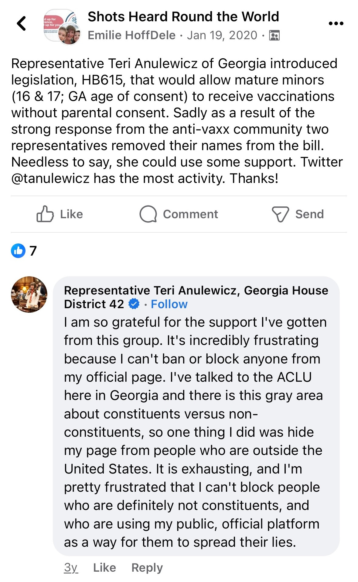 I am so grateful for the support I've gotten from this group. It's incredibly frustrating because I can't ban or block anyone from my official page. I've talked to the ACLU here in Georgia and there is this gray area about constituents versus non-constituents, so one thing I did was hide my page from people who are outside the United States. It is exhausting, and I'm pretty frustrated that I can't block people who are definitely not constituents, and who are using my public, official platform as a way for them to spread their lies.Teri Anulewicz