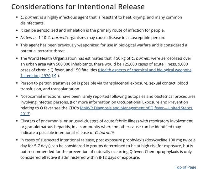 The WHO link the CDC provided is curious because it has not been functional for several years. The CDC page even links to an archive page that is also unavailable. Here is the information on a working version of the WHO page that discusses how much weaponized Coxiella to spray over an urban area.