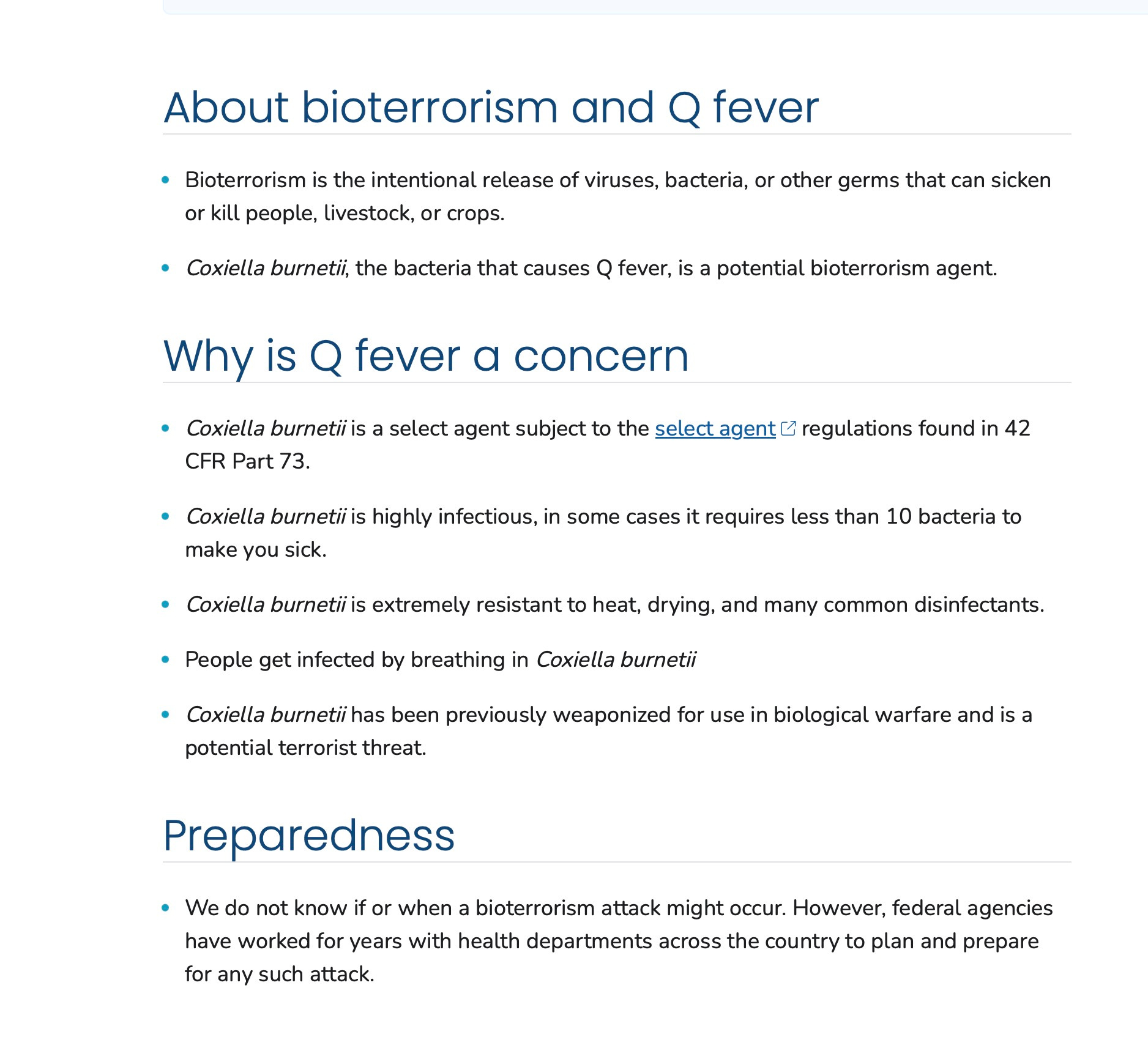 Since I referenced Q-Fever in "Epidemic of Fraud", the CDC deleted some info about a bacteria Coxiella Burnetti, including a section called 'Considerations for intentional release'.